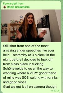 It is Saturday night in Berlin. I’m in a bar with my friends Normal Slavic Girl (formerly known as Unicorn Creature), Closety Gem, and Privateman. Sina is also here. I’ve been at his place all day working on The Project. I’m making a movie in which I investigate the true purpose of art. In doing so, I’m making my own life subject.